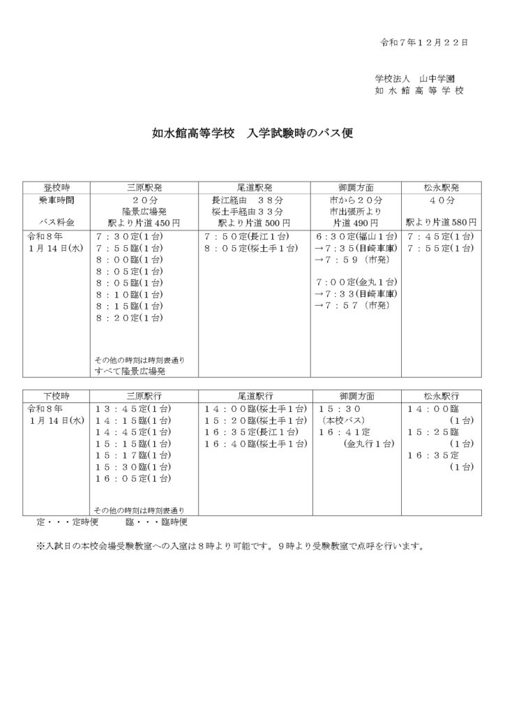 如水館高等学校入学試験の実施に伴い、入試日当日(1月14日)のバス時刻表についてご案内いたします。